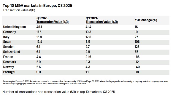 În contrast, piața de M&A din Franța a resimțit presiuni accentuate, pe fondul incertitudinii politice persistente. Valoarea totală a tranzacțiilor a scăzut drastic la 4,4 miliarde de dolari, de la 31,6 miliarde de dolari în perioada similară a anului trecut, marcând un declin de 86%. Această evoluție reflectă un sentiment negativ mai amplu în piețele financiare, randamentele obligațiunilor guvernamentale franceze depășind nivelurile din Italia și Spania, un semnal clar al impactului riscului politic asupra încrederii investitorilor.